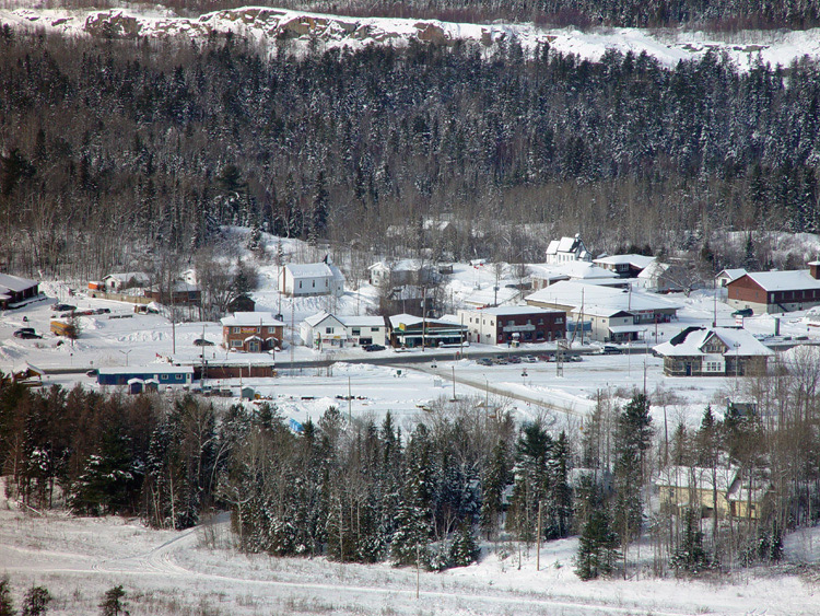 A larger portion of the town centre, this shot includes the Orient Garden Restaurant, One Stop Trading Post, Busy Bee Restaurant, Temagami Country Dreams, the Temagami Train Station, United, Catholic, and Anglican churches, and the Temagami Coop Grocery Store.